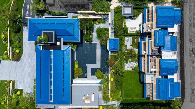 入口处9米长的黑金砂石瀑墙,经匠人千锤百炼手工斧凿,方呈现出“落瀑清音”的意境与依山而建的嶙峋质感;46樘青釉陶瓷屏扇历经多轮窑火淬炼,终得“天青过雨”的秘色瓷韵;屋顶特制靛蓝陶瓦以双倍于小青瓦的成本,在阳光下流淌出《千里江山图》的青绿幻境。
