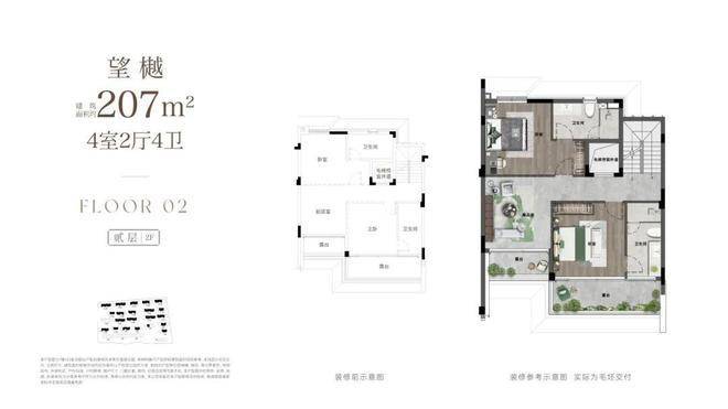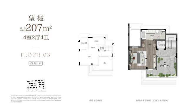 在产品设计上,项目创新实现了大面宽、高「院房比」,拥有极致尺度与通透感。以建面约207㎡四房四卫户型为例,一层客餐厅面宽达约9米(远超杭州上一代排屋约7米的普遍水平)。巨幅落地玻璃取代传统实墙,最大限度引入自然光、清风与庭院景观,实现室内外交融无界。