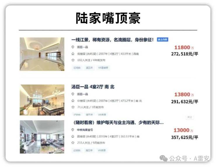 国内其他核心城市顶豪中,深圳湾一号前排无遮挡海景二手普遍30万+/㎡,恒裕滨城二期一线海景30万+/㎡,中信信悦湾顶复38万/㎡,广州侨鑫富悦台28万+/㎡;