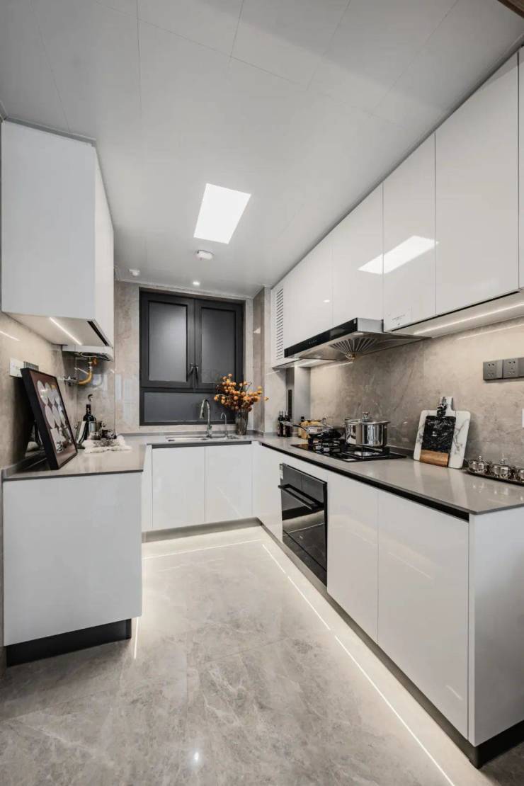 厨房使用科勒(或同等品牌)厨盆、厨盆龙头,使用起来更加方便;更有定制橱柜、石英石台面,美观耐用的同时也方便日常清洗。厨房墙砖、地砖、吊顶都是统一色调,非常美观。