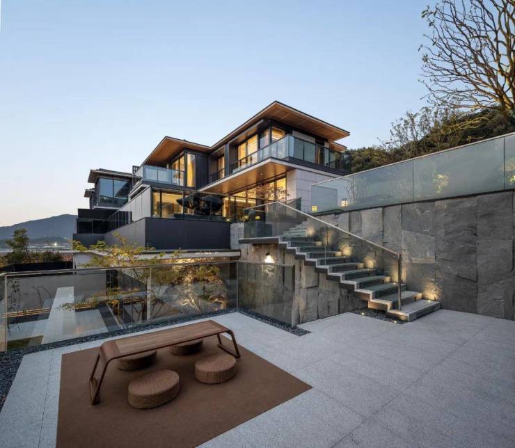 建筑外观方面,轻薄且层次分明的檐口设计展现出一种舒展、大气而又不失飘逸灵动的韵味。简洁明了的几何线条与和谐的色彩搭配,与青山湖的自然风光相映成趣,共同营造出一种精致而现代的生活氛围。