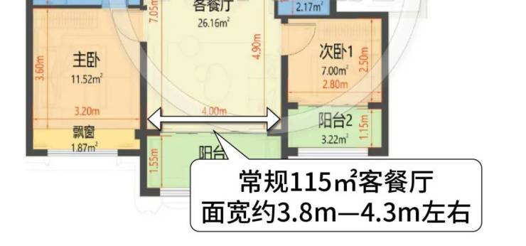 115-120㎡的高层产品,客餐厅的面宽大多都在3.8-4.3米左右。