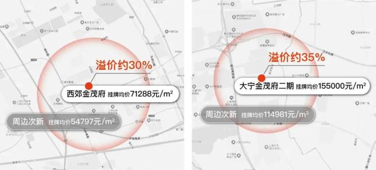大宁金茂府二期挂牌约15.5万/㎡,周边次新整体挂牌约11.5万/㎡,金茂府有约35%溢价;