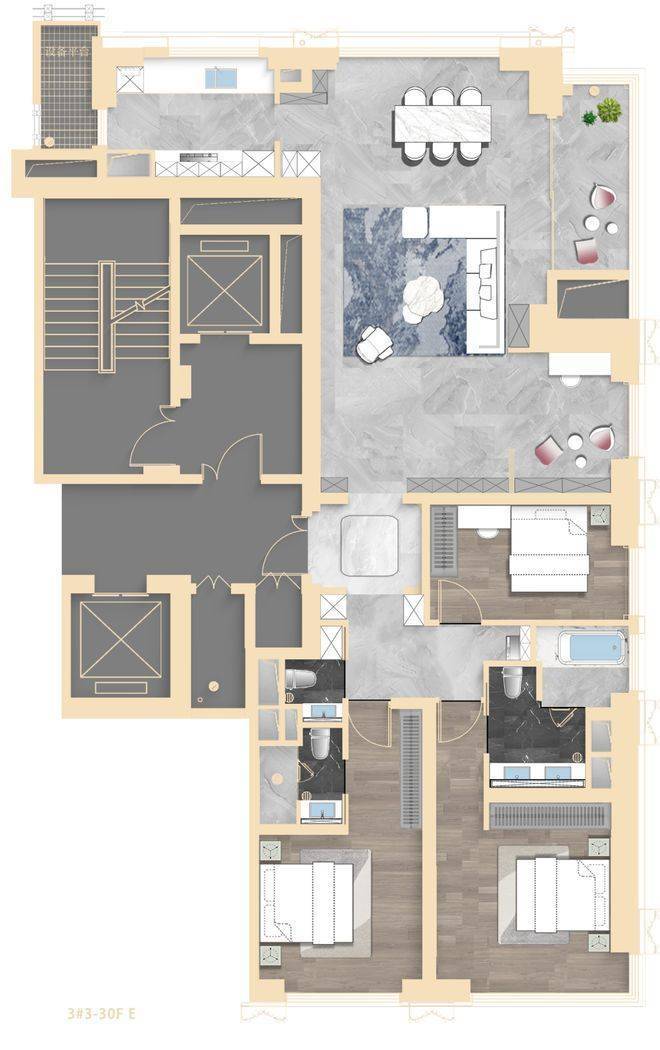 其中3#为超高层,北向可观小区绿化和苏河景观,高区可瞰三件套盛景。