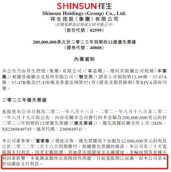 时间来到2022年3月21日,祥生控股集团发布公告称,公司未能按期支付2亿美元债的1200万美元利息。