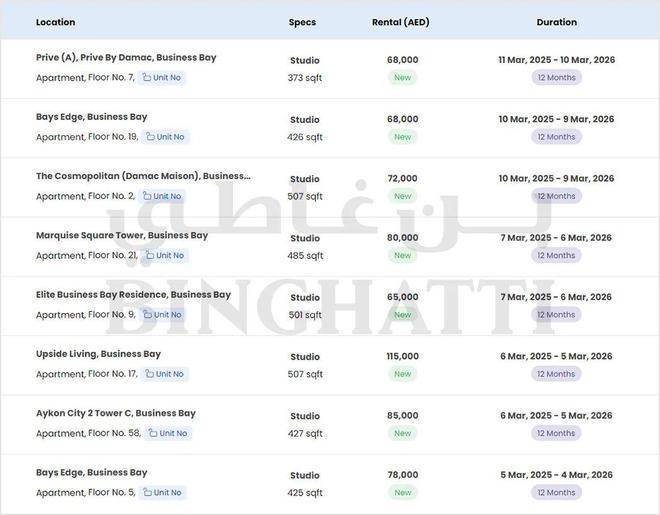 近期单间(Studio)租金概况, 租金范围6.5万-11.5万迪拉姆/年,约13万-23万RMB/年;