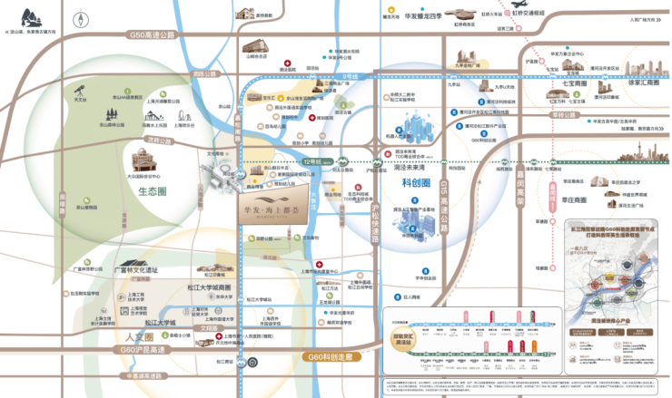 华发股份首次进驻松江,带着全新的“优+产品体系 5.0”,给洞泾、甚至给松江带来了当前区域内综合品质颇高的作品。依据上海生态环境保护“十四五”规划,立足于国际领先的可持续项目规划,华发·海上都荟结合其自身独有的聚合优势,在传统 TOD 规划的基础上,增添了无法复制的土地生态资源,向东与 G60 科创走廊中以镇命名的区块——洞泾人工智能产业基地相连接;向南能够直通亚洲的大学城之一——松江大学城;北侧紧靠上海陆面的自然山林资源——佘山国家旅游度假区。板块紧密贴合上海 2035 以及松江 2035 发展的关键节点,将该区域塑造为“科创+文教+生态”交汇的核心新城模式,创建出一个全新的城市单元范例。