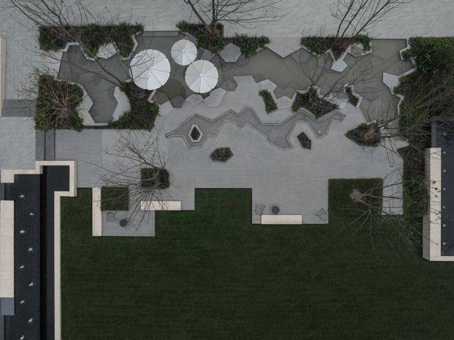 步入社区,首入眼帘的是约6米高水幕的下沉式山水庭院,与周围建筑融为一体,将自然与松弛感带给社区。