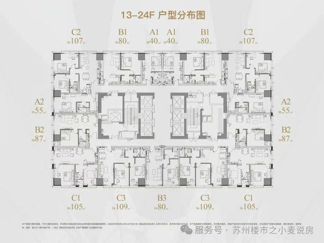 低区13-24层,户型分别是40㎡,55㎡,80㎡,107㎡;