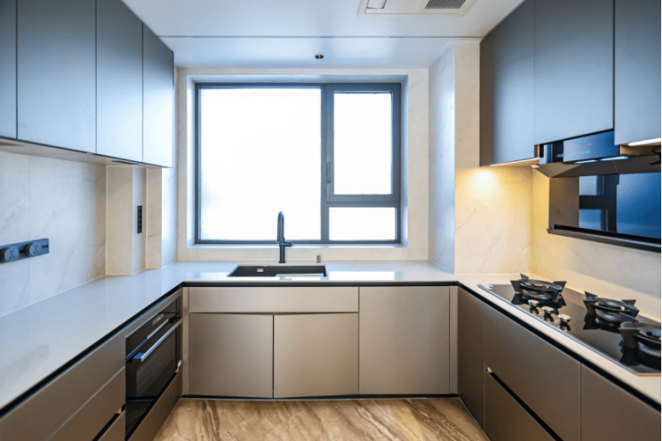 厨房为 U型布局,配备 博世四件套厨电,包含三眼灶、油烟机、洗碗机、蒸烤一体机,还有 科勒抽拉龙头及日立厨房空调等高端品牌。