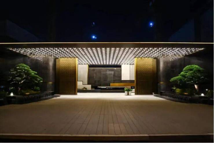 大门两侧采用复古与现代交融的乱纹黄古铜饰面,与6米挑高的建筑体量形成视觉张力,延展墙体通铺亚光面深色奢石大理石,恢弘大气。