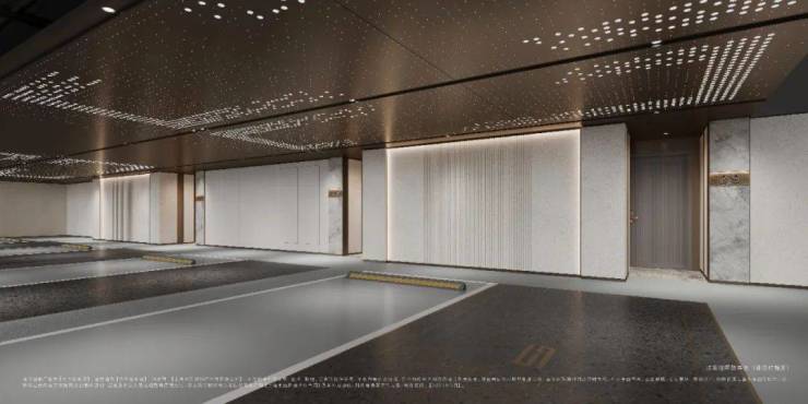 项目地下精装车库非常奢雅,汽车坡道采用氛围照明,缓解光环境变化,搭配星空顶造型彰显独特。