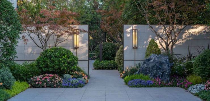 选用温润典雅的天然石材作为基底,中轴对称式布局彰显高门气魄,水景内涌泉汨汨且搭配泛星灯光,转角处的精美艺术景墙,为业主营造更具仪式感和尊贵感的归家体验。