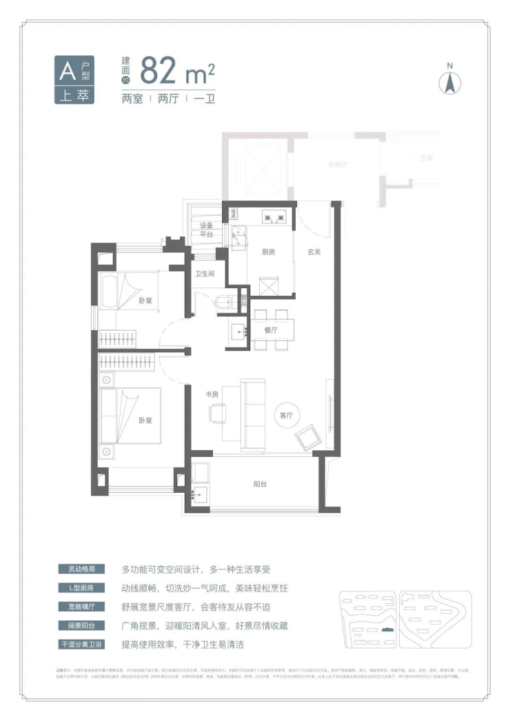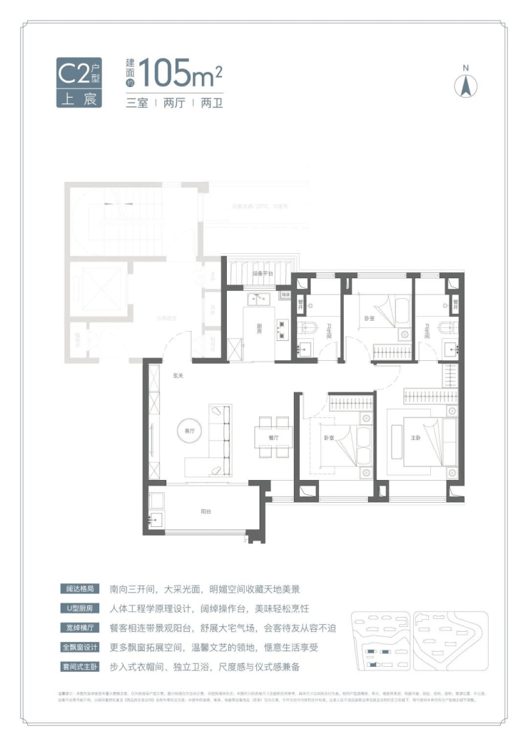 U型厨房、餐厅、客厅、阳台一线联通,南北通透。主卧套房、全卧飘窗、次卫干湿分离也都是标配。