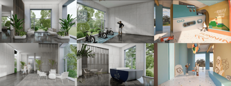 在沿河水岸,国贸打造沿河客厅,可以日常会客。难得的是,社区内部还配置四大主题八大架空层泛会所,用于儿童阅读、青年运动、老年康养等。