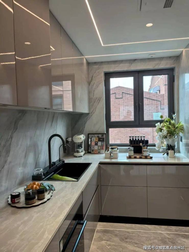 现代简洁是基调,采用朴素亲切的暖灰色调与精致斜切的腰线组合。