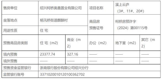 柯桥区人民政府发布了溪上云庐预售许可公告,商品房预售证号:柯桥房预许字(2024)第00115号。