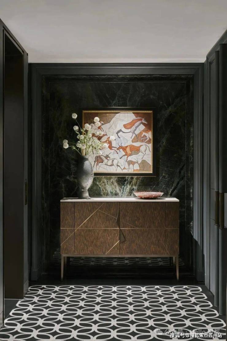 建筑面积约495㎡传家大宅,海派气质内外辉映;深色木饰面与柔和的刺绣主背景,框定空间层次格局,营造稳当厚重的氛围基调,法式留白的墙面与顶部造型,与原筑提取的典型拼花地砖相呼应,经典的精致与典雅,海派传家大宅的气度不言而明。