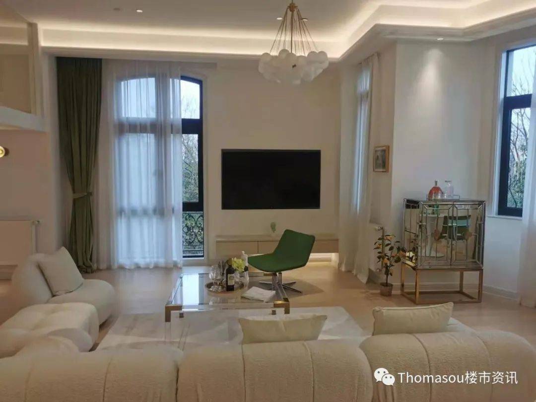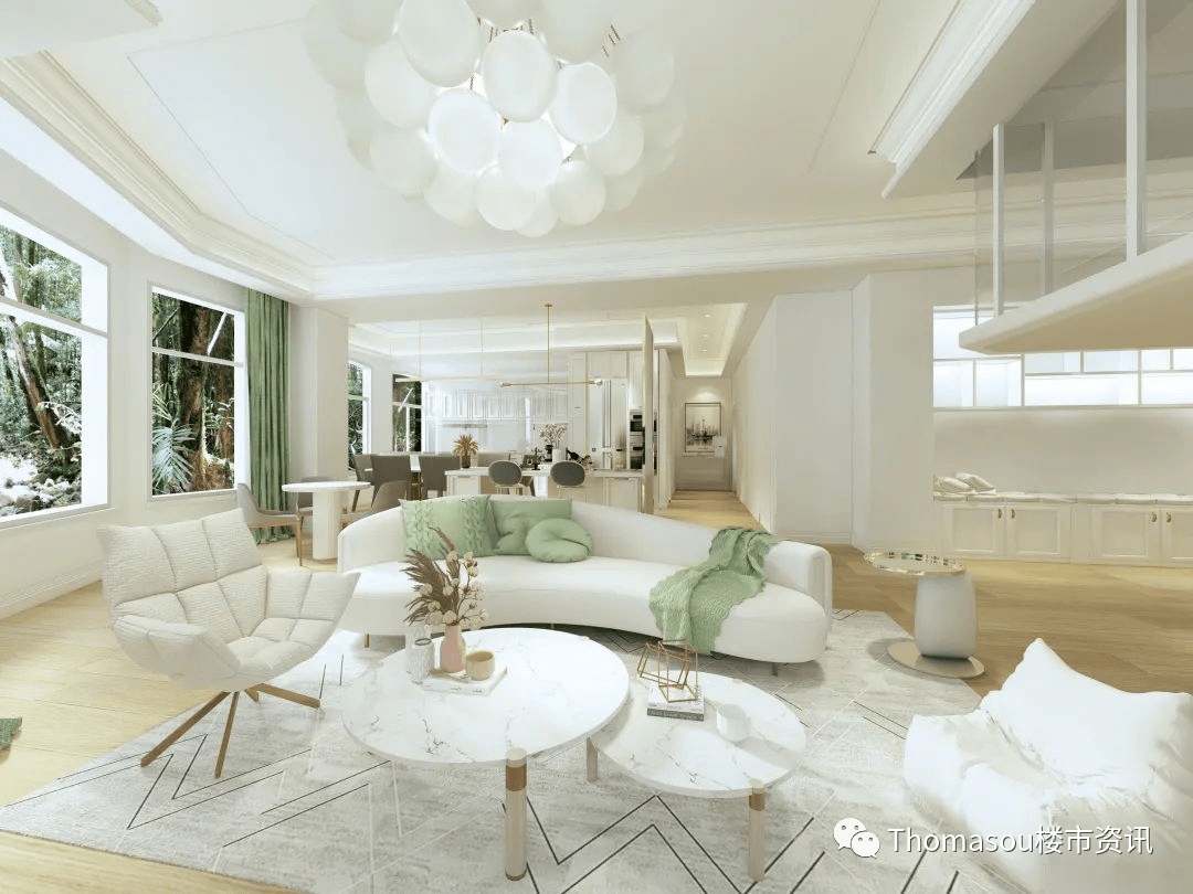 客厅:整个客厅与餐厅直面三林公园,在客厅通过落地玻璃窗可以270度观赏三林公园的四季美景,呼吸自然氧吧给我们带来新鲜空气。