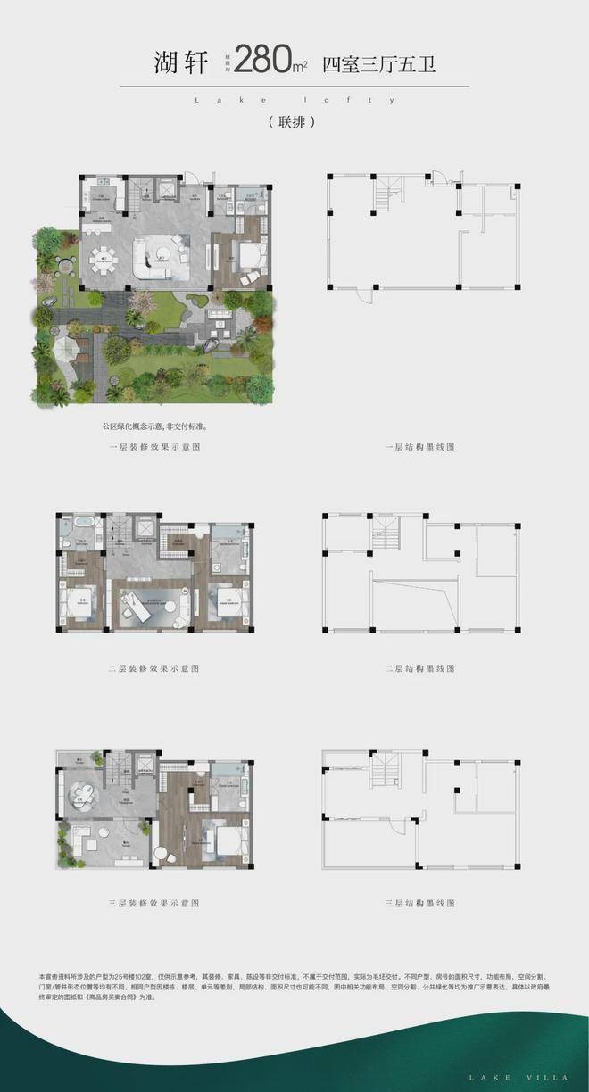 (1)联排:打造约246m²、约256m²(边户)、约280m²三个户型面积,以迭代的联排作品,致敬真别墅的回归