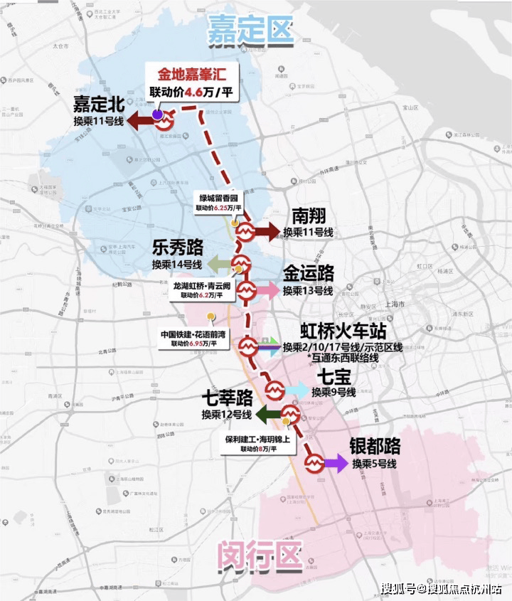 直线距离约200米嘉闵线(在建),8站直达大虹桥,连接七宝、莘庄等多个CBD,不论是上下班、聚会、商务出差等都十分便捷。另外值得一提的是沿线新盘均价均在6-8万区间,其中约350万总价的潜力盘或许只有金地嘉峯汇!