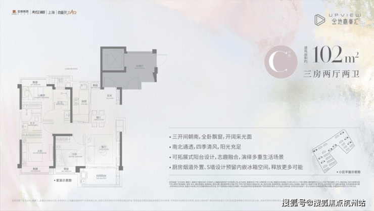 以及我们的网红爆款,建面约102㎡(C户型)三房两厅两卫,不仅保留了其小户型所有的优势,更增强了空间感和舒适度!