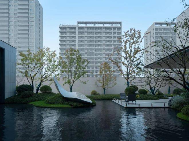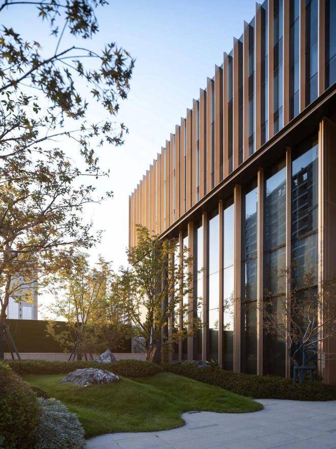 前场风格简约的归家界面,金属线性格栅与通透玻璃打造酒店式的尊贵落客体验。多重的高矮景墙,围合引导客流进入归家大堂。运用自然元素,在一草一木、一静一动中书写诗意空间。