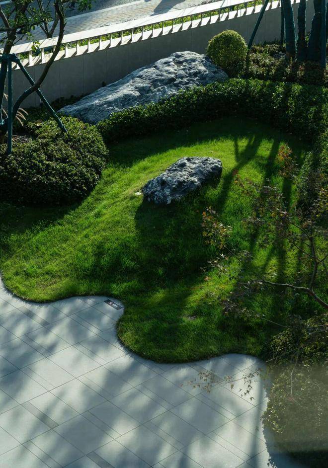 △曲线线条切割石材,设计灵感来源于水的波纹,用无垠的草坪呈现水景,置石为扁舟,别有一番意境。