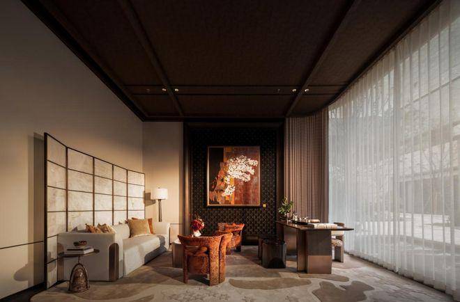 项目首层通过硬朗直线呼应柔和曲线勾勒,辅以温润石材与古铜色金属线条融合,打造东西方美学共融的艺术藏品。