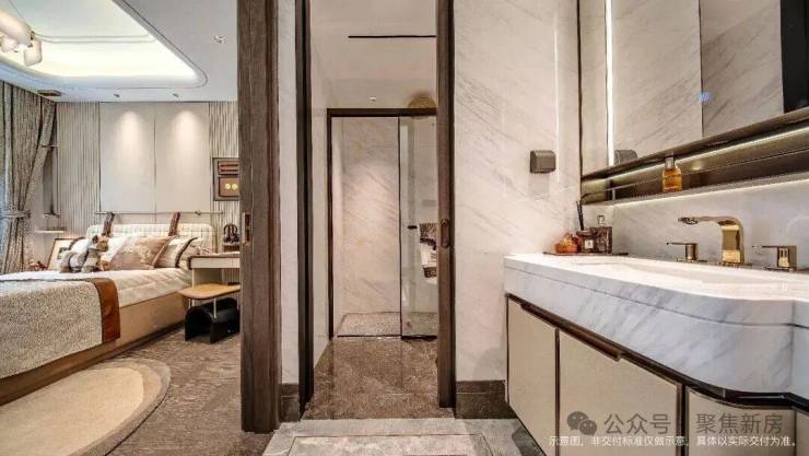 开阔的卧室空间,独立主卫设计,双台盆让晨间洗漱不再拥挤,浴缸正对着窗,泡澡时能看美景在玻璃上流淌,细节里全是"被照顾"的温柔。