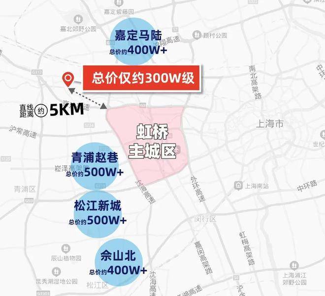 通过百度地图测距我们发现:安亭距离虹桥主城区直线距离仅约5公里,但总价仅约300万级!