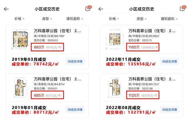 以张江万科翡翠公园为例,2019年二手房成交价为7.87-8.07万/㎡,2022年最新成交价已经涨至13.27-13.59万/㎡!
