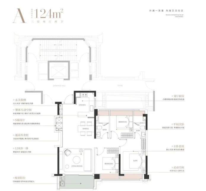 建面约124㎡的边厅“全景舱”户型,是外滩板块极致稀缺的臻品。它以三房布局满足主流家庭需求,更以无遮挡的视野与巨幕般的边厅落地窗,将城市天际线化为私藏画卷。主卧270°L型飘窗,让阳光与风景成为生活的主角。