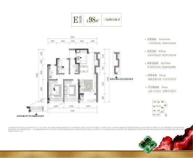 建面约 98㎡百平内稀缺小户S墙设计、库式入户玄关、半开放式厨房、三开间朝阳格局,赋予空间与家庭同步生长的张力,让空间越住越大。