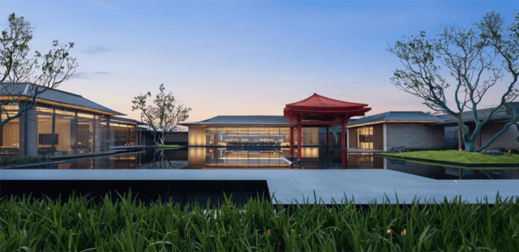 占地约1300㎡的镜面水院,天空、树影、建筑皆倒影于水面,光影变化中映射出四季风光。