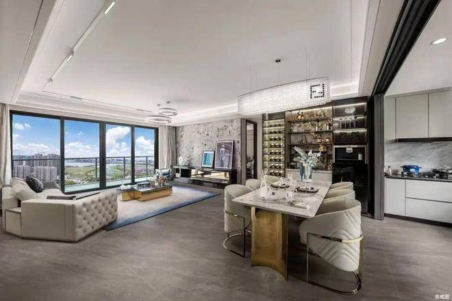 比如大横厅,改造性超强,U型小西厨+餐客厅+连通阳台,270°环幕视野,开间长约7.8米双联阔景阳台,尺度无敌!