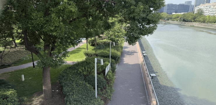 望向地块北侧,河岸绿地郁郁葱葱,淀浦河泛着粼粼波光,两岸撑起浓绿的穹顶,偶尔有白鹭掠过水面,沿河跑道蜿蜒其间,环境清幽舒适。