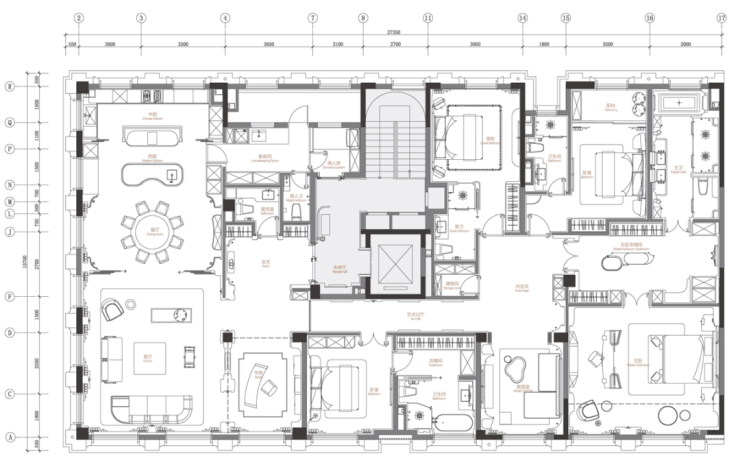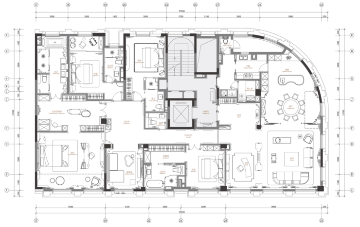 在高层的底层商业部分,项目选用了来自巴西的奢石波多尔红,搭配高难度的双曲面工艺,呈现出独特的优雅与魅力。商业以上的建筑立面,用巴西进口玫瑰金麻造型石材搭配局部铝板及金属线条,强化了现代感,传递出新旧交融的气质。