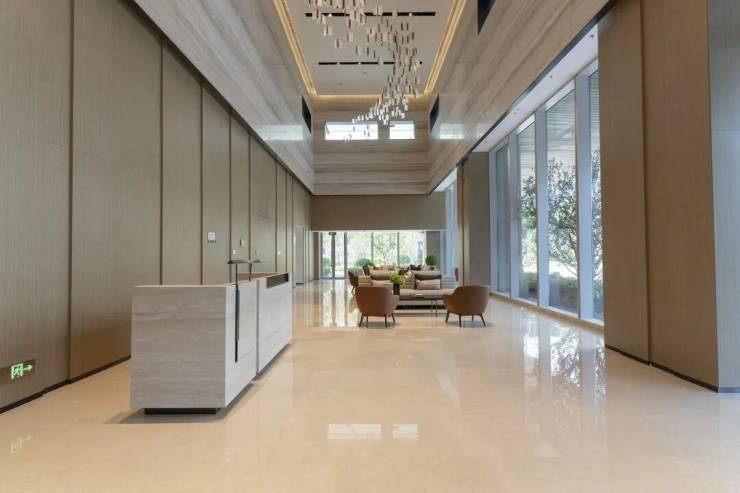 地面采用大块的大理石拼贴而成,整体与苏州星级酒店大堂风格一脉相承,档次无需多言。软装风风格也延续了低调、雅奢的风格,即便用料毫不手软。