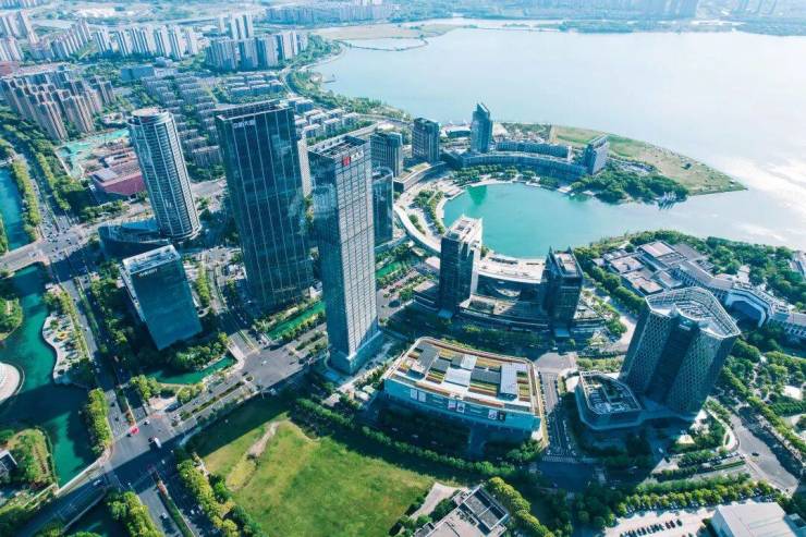 整栋楼立面采用全玻璃幕墙打造,虽然成本高昂,但是隔热保温,节能环保,更重要的是,光幕质感配上一线湖景,呈现丰富、灵动且柔和的光影变幻,构成流动的城市画卷。