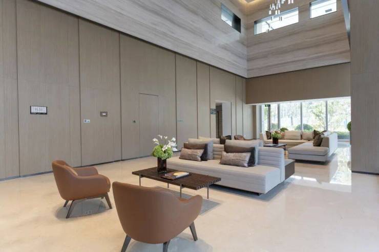 首层住宅大堂,大尺度挑高设计,自带恢弘大气的归家仪式感。高级灰墙面搭配木饰纹,材质考究,创造出全新高雅风格~