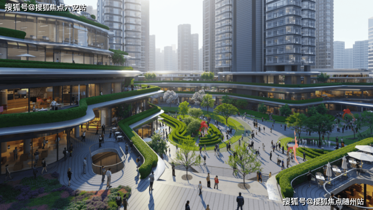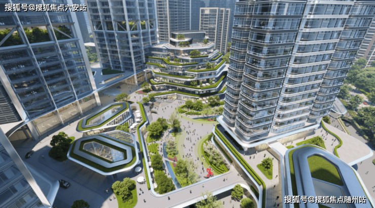 项目规划约14000㎡景观绿地和垂直花园系统,包含屋顶跑道、空中花园等,复刻西雅图亚马逊总部森林公园理念。6000㎡中央广场对标伦敦市政厅广场,以开放式设计串联建筑与城市,打造“森林微城市”的办公新场景。