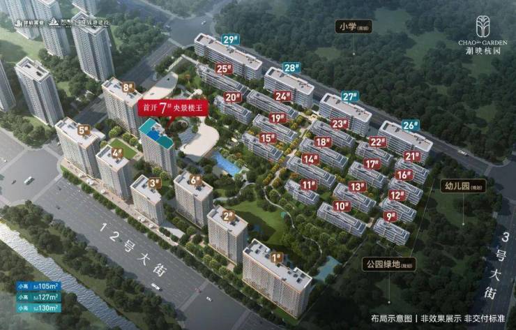 为最大化实现公园的栖居理想,潮映杭园依园排布揽景小高层、墅境洋房、都市排屋三重奢品。建筑面积约105-130㎡揽景小高层首发面市,以极致化的揽景采光面、超90%+高得房率,重新定义金沙湖改善尺度。