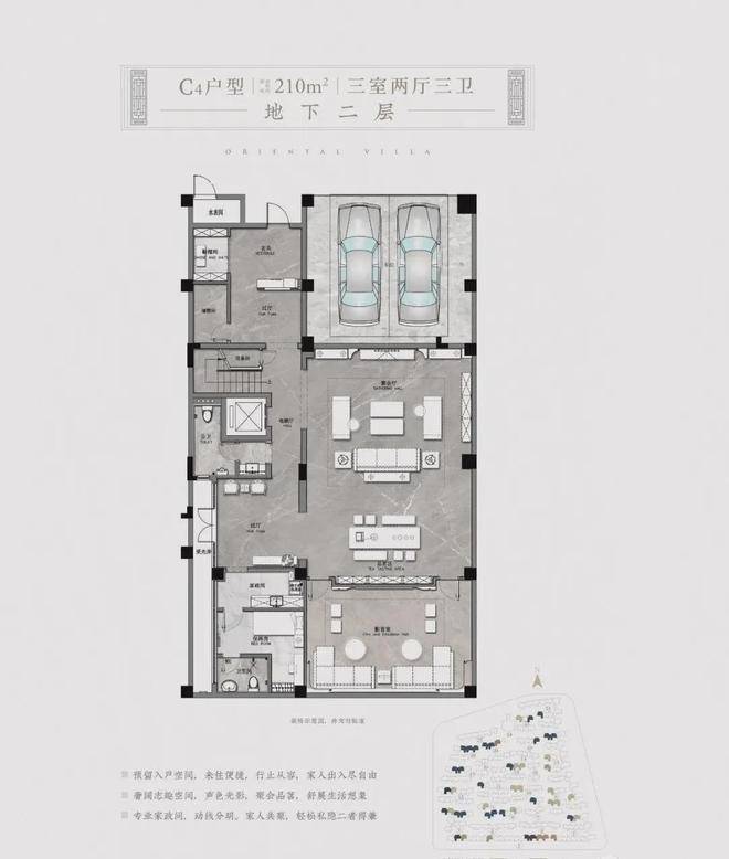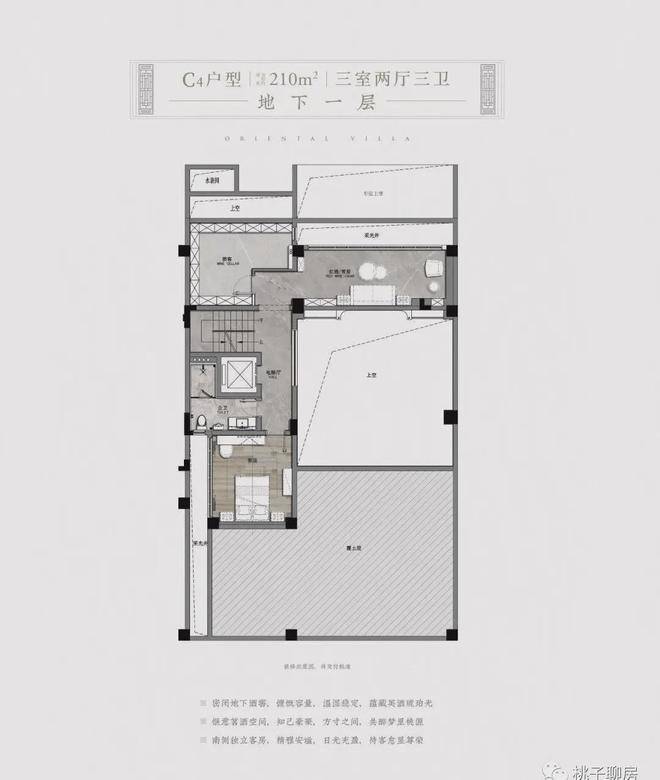 以项目东北角的建面约330㎡H户型为例,地下二层的室内可配置保姆房、