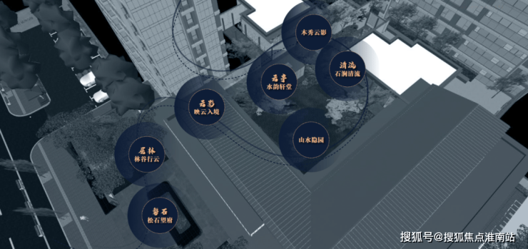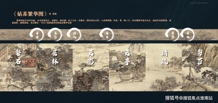 项目参考《姑苏繁华图》为背景,将清代苏州城的繁华盛况融合现代景观元素,提炼出「磐石、层林、云影、云亭、清流、翠台」六大场景,每个区域都展现着独特的设计理念和艺术氛围,并传递出居住环境的生态氛围。
