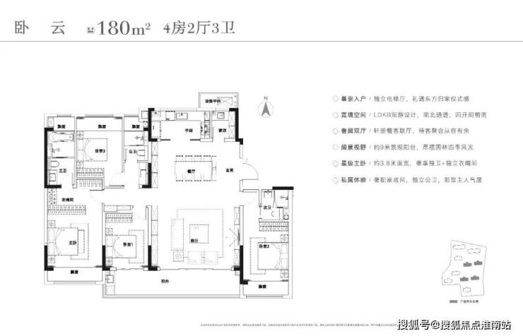 建面约180㎡四房两厅三卫:
