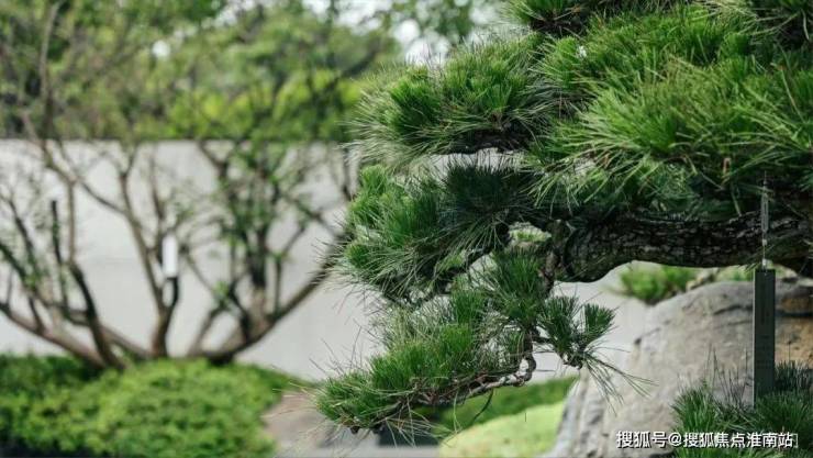 第二幅画框,透过松枝和玻璃的障景可以隐约看见山水隐园的景色,影影绰绰,前景的松石如同屏风,欲扬先抑,增加层次。