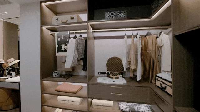 约55㎡豪华全套房主卧,除了放一张超大双人床,还能安排上男女双衣帽间、带双台盆的独卫,在功能方面直接多了一个level,关上房门就是主人的“小世界”。