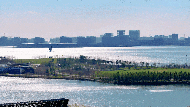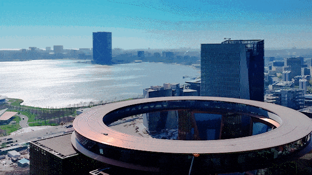 在滴水湖的12点钟方向,一座金色的巨型圆环熠熠生辉,这便是临港滴水湖金融湾的核心地标——“荣耀之环”。
