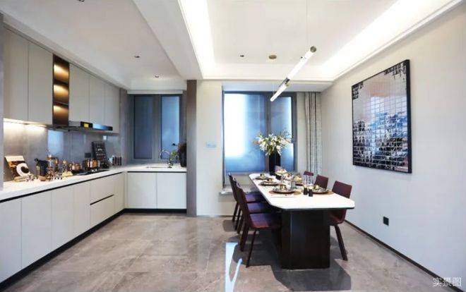 项目上的餐厅并没有像其他横厅那样,与客厅公用空间,而是连着厨房的独立空间,这样既符合人体动线,又不会打扰到客厅的功能活动,并且餐厅自带观景飘窗,不用担心采光的问题,空间也足够放一张8人桌,一家人围坐一起,其乐融融。